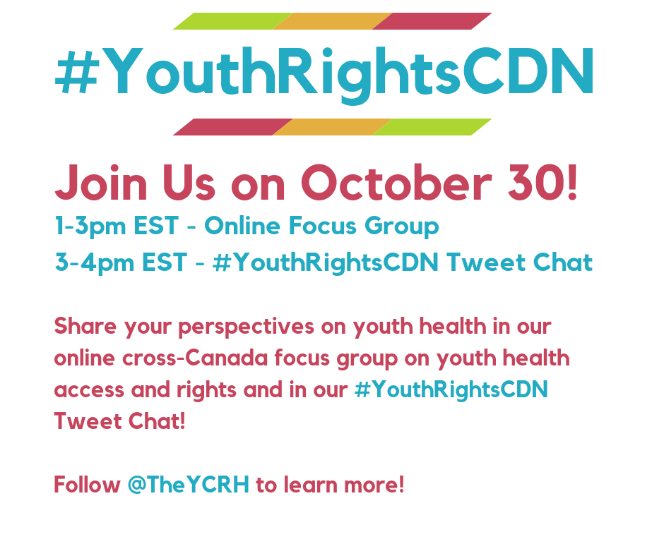 • Following the focus group, @TheYCRH will be hosting a Tweet chat from 3-4pm EST. They’ll use the hashtag, #YouthRightsCDN to talk about what policy actions youth want to see to make health care and rights more accessible, and how governments can partner with youth to make health policies stronger.