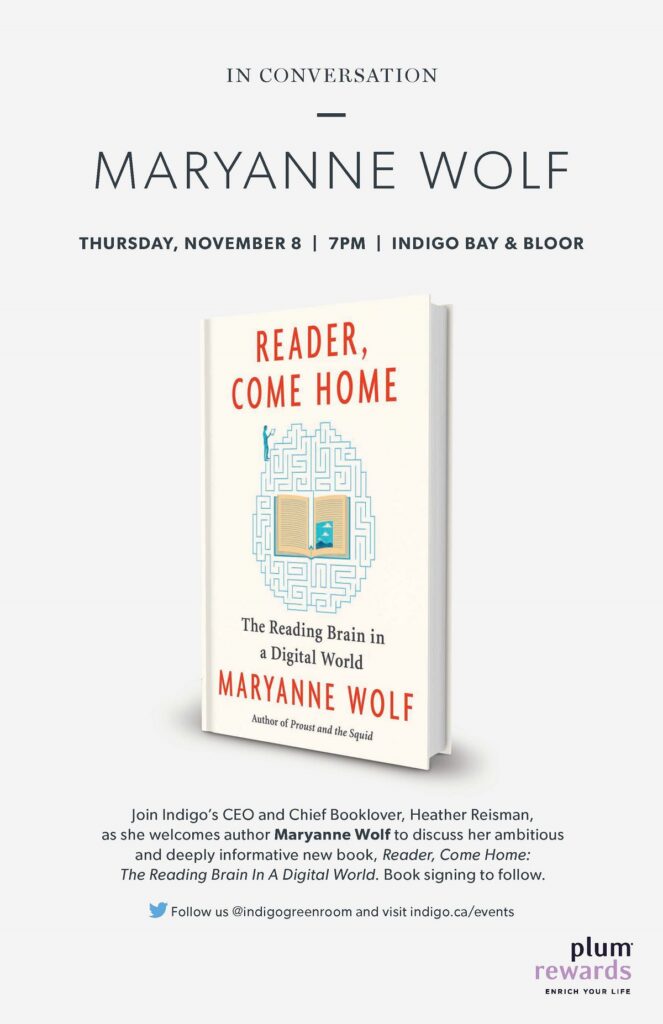 Dr. Maryanne Wolf, cognitive neuroscientist, Director of the Center for Dyslexia, Diverse Learners, and Social Justice at UCLA, and board member of the Canadian Children’s Literacy Foundation, discusses the impact of technology – both positive and negative – on our reading brains and her new book, Reader, Come Home: The Reading Brain in the Digital World, with Indigo CEO Heather Reisman at 7pm on Thursday, November 8 at Indigo Manulife (Bay and Bloor Streets in Toronto).