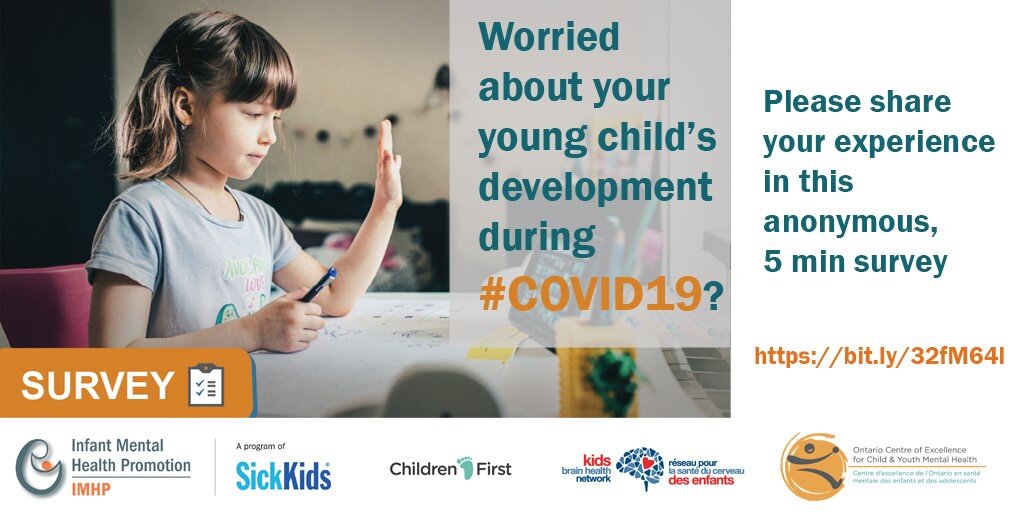 Infant Mental Health Promotion (IMHP) at the Hospital for Sick Children, in collaboration with the Ontario Centre of Excellence for Child and Youth Mental Health (The Centre), Kids Brain Health Network (KBHN) and Children First would like to hear parents’ thoughts on how child and youth mental health system can improve the quality of services for children under 6 throughout the COVID-19 pandemic.