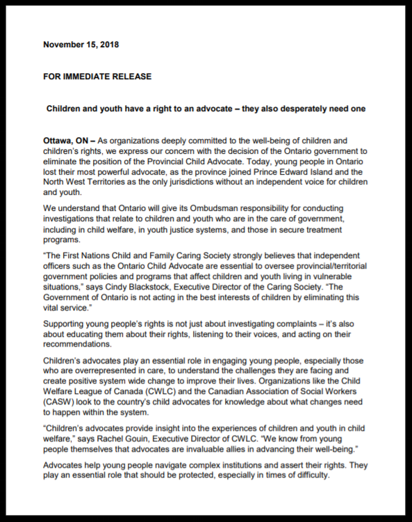 Today, ten leading organizations released a statement urging the Government of Ontario to reconsider its decision to eliminate the position of the Provincial Child Advocate. The statement was signed by: Campaign 2000: End Child and Family Poverty in Canada Canadian Association of Social Workers Canadian Coalition for the Rights of Children Child Welfare League of […]