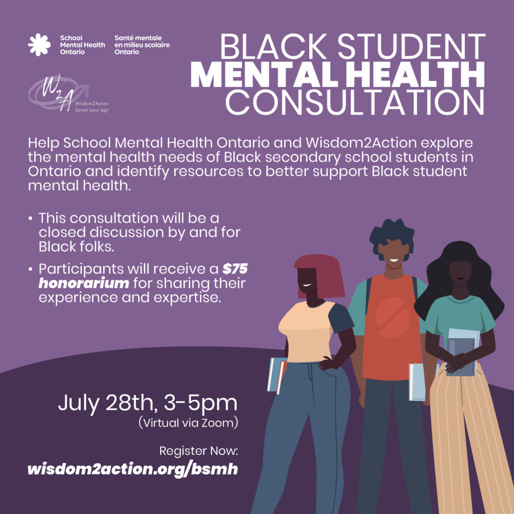 Wisdom2Action and School Mental Health Ontario will be holding a consultation on Black Student Mental Health in Ontario taking place on July 28th from 3-5PM EST. This consultation will bring together Black secondary school students in Ontario to explore how Wisdom2Action and School Mental Health Ontario can better support the mental health and well-being of […]
