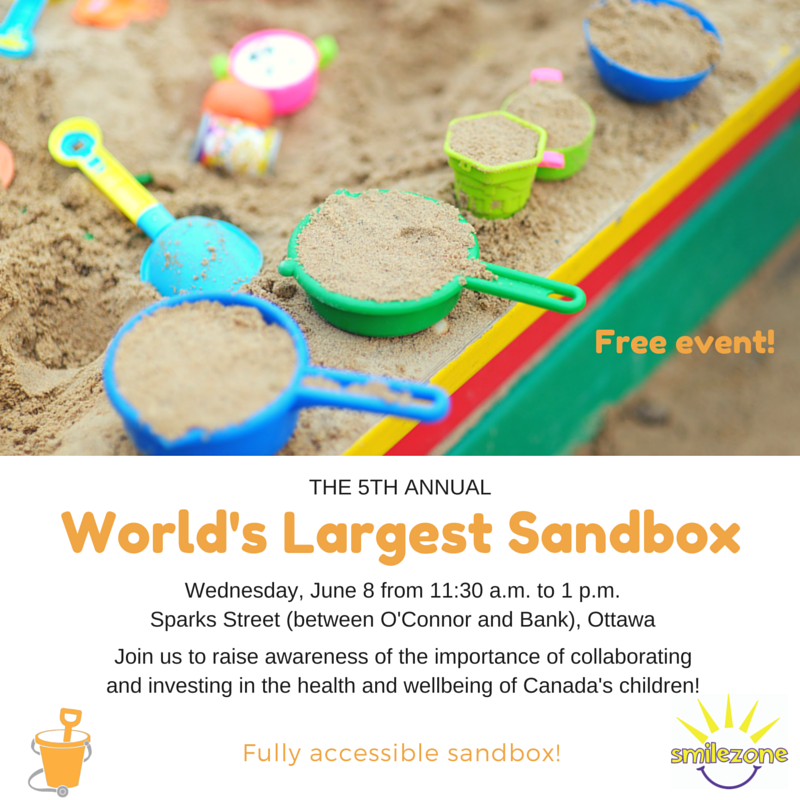 The Sandbox Project is seeking a few more volunteers for our 5th annual World’s Largest Sandbox. Wednesday, June 8th, 201611:30 a.m. to 1 p.m.Sparks Street (between O’Connor and Bank), Ottawa If you are in the Ottawa area and would like to help out, please contact Mary-Ellen.
