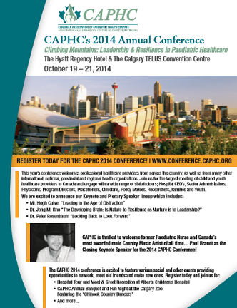 Canadian Association of Paediatric Health Centres (CAPHC) 2014 Annual ConferenceClimbing Mountains: Leadership & Resilience in Paediatric HealthcareThe Hyatt Regency Hotel & The Calgary TELUS Convention CentreOctober 19 to 21, 2014 Please click here (or the image above) to view the enlarged PDF version.
